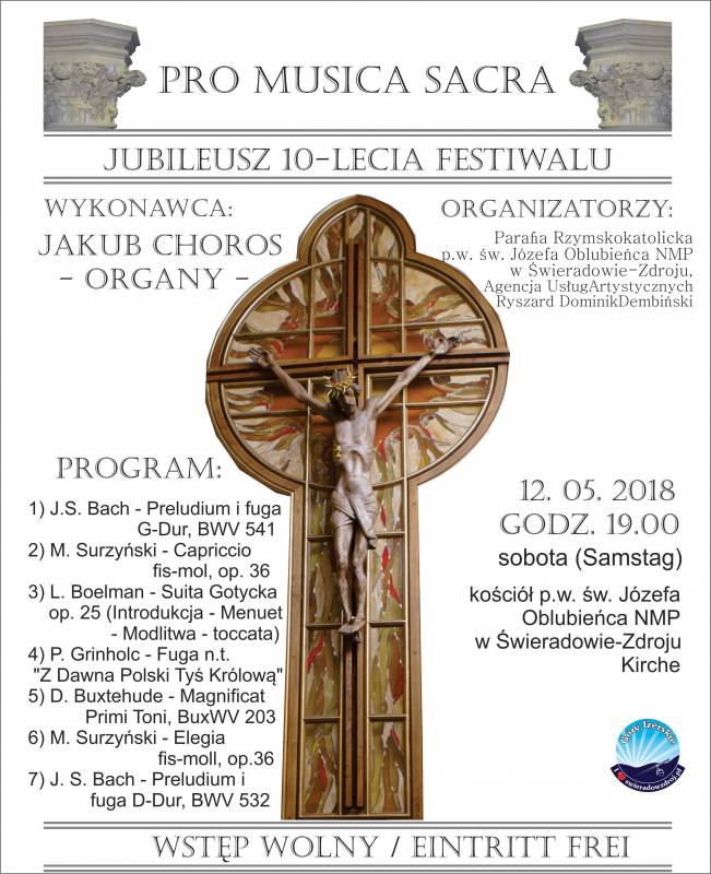 Strona główna Aktualności KONCERT MUZYKI SAKRALNEJ W ŚWIERADOWIE-ZDROJU Aktualności KONCERT MUZYKI SAKRALNEJ W ŚWIERADOWIE-ZDROJU Przez Tomasz Słowiński - 8 maja 2018 2165 0 Podziel się na Facebooku Tweet (Ćwierkaj) na Twitterze 12 maja w sobotę o godzinie 19:00 w Kościele p.w. św. Józefa Oblubieńca NMP w Świeradowie-Zdroju odbędzie się koncert muzyki sakralnej na organach w wykonaniu Jakuba Choros Multimedia PODOBNE ARTYKUŁYWIĘCEJ OD AUTORA Aktualności Pomoc dla bezdomnych zwierząt… ZOO LATTE 19 lutego – WIDZIMY SIE WE WROCŁAWIU. Aktualności Karnawał 2026 trwa a w okolicy? Aktualności 34 Finał WOŚP w Świeradowie-Zdroju 25.01.2026 r. OBSERWUJ NAS1,365FaniLubię0ObserwującyObserwuj0ObserwującyObserwuj0SubskrybującySubskrybuj POPULARNE Przewoził tytoń bez skarbowych znaków akcyzy 23 marca 2017 Zaginął pies ratowniczy! – ktoś widział? – apel 11 grudnia 2020 SKRADZIONO STACJE METEOROLOGICZNĄ ORAZ OBRAZY WANDALIZMU NA WIEŻY WIDOKOWEJ 4 czerwca 2020 I runda Pucharu Polski na szczeblu okręgu jeleniogórskiego 1 lipca 2017 Załaduj więcej HOT NEWS Aktualności ZAPRASZAMY DO WOJSKA – 30-sierpnia 2024 r. – pełna relacja filmowa Aktualności Koniec “Świeżaków” Rozrywka Wystawa malarska Doroty Ferens – relacja filmowa Aktualności List Dolnośląskiego Kuratora Oświaty do dyrektorów przedszkoli, szkół i placówek